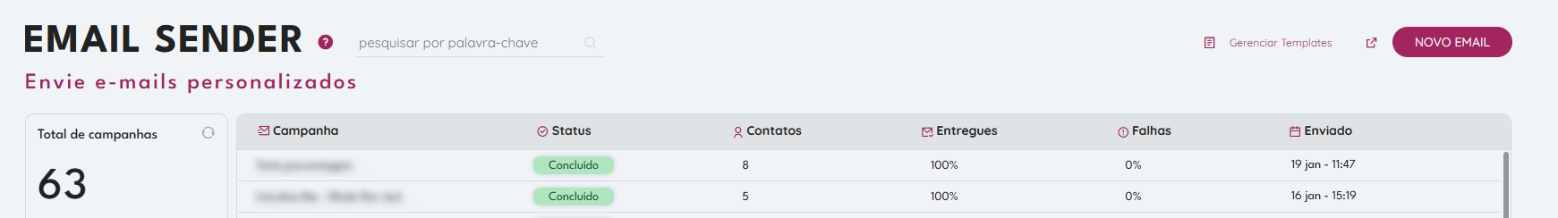 Agora você pode organizar disparos em massa através de Campanhas, permitindo uma análise unificada do sucesso dos seus envios sem perder a visão individual.