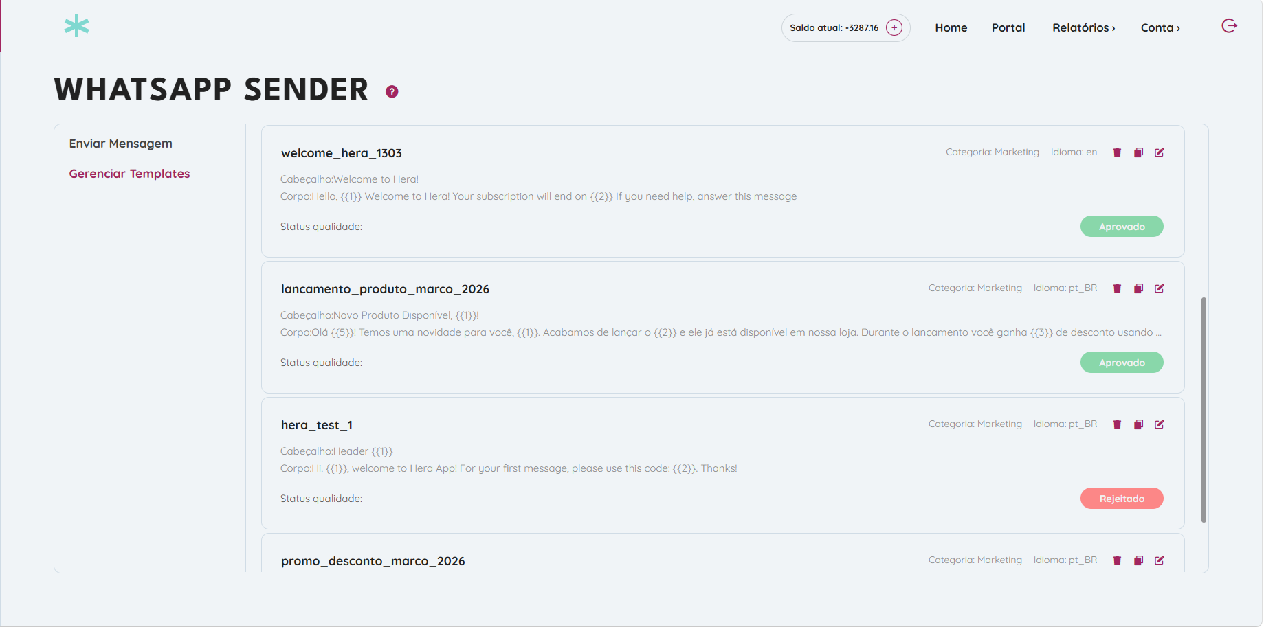Você poderá gerenciar seus templates do WhatsApp diretamente no HeraApp. Você pode criar, editar, visualizar e excluir modelos, acompanhar os status de aprovação e de qualidade, mantendo tudo sincronizado em tempo real com a Meta.
