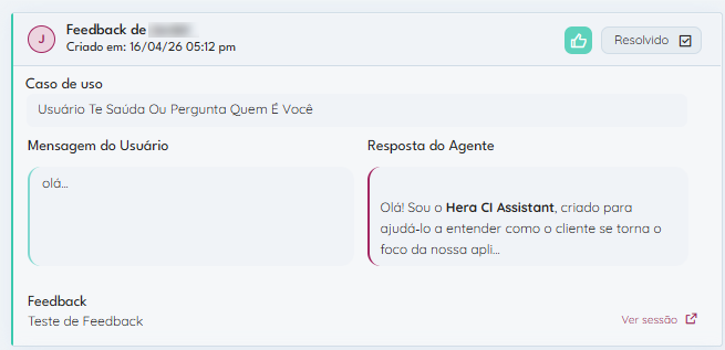 Redesenhamos a experiência dos feedbackes A nova tela de feedbacks torna a correção das respostas e a configuração de saídas mais intuitivas para o refinamento do seu agente. Incluímos a identificação do usuário que reportou o feedback.