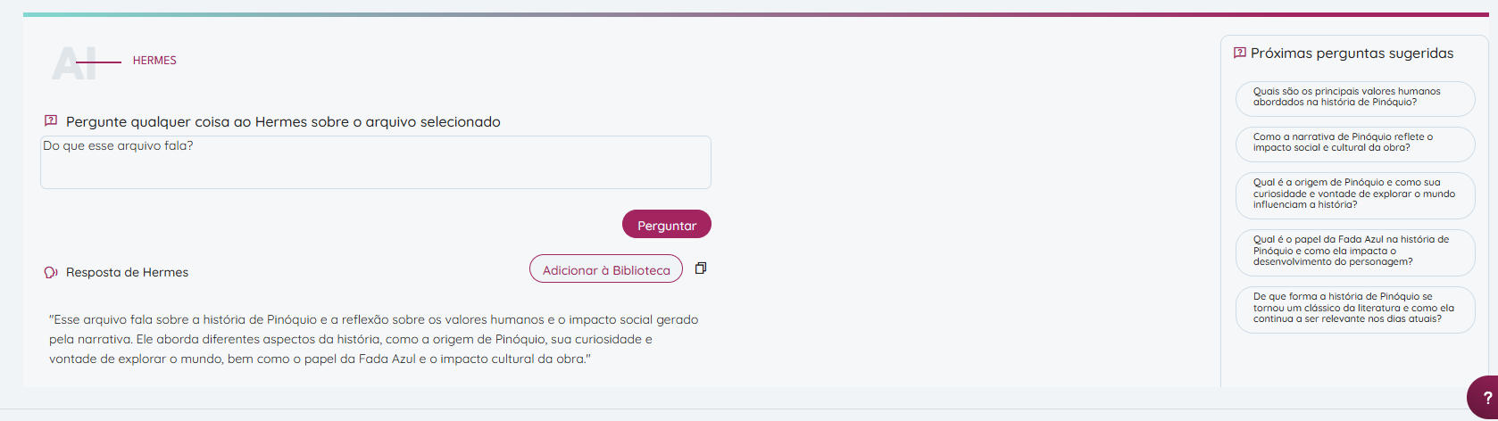Com o Content Interaction, você pode "conversar" com seus próprios conteúdos através da IA Hermes de forma simples e inteligente. Basta escolher um arquivo da sua biblioteca e deixar que Hermes te ajude a explorar, entender e até descobrir detalhes que você talvez não tivesse pensado.