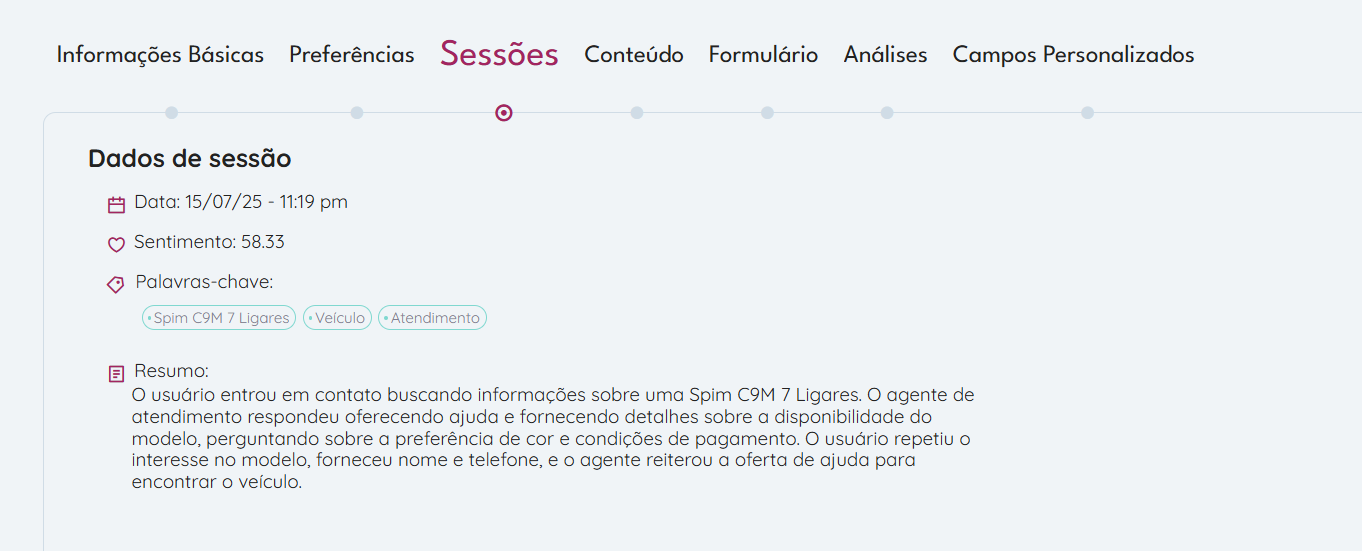 As Sessões apresentam os registros das interações entre os contatos e os Agentes Hera. Ela organiza informações relevantes de cada conversa em um formato estruturado, permitindo acompanhar palavras-chave, sentimentos, resumos e outros indicadores extraídos automaticamente após a conversa com o agente.